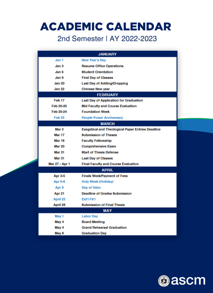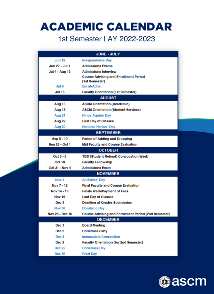 To give you an overview of the events this Academic Year 2022-2023 at ASCM, we provide you this. For more information you may contact us in our email: info@ascm.edu.ph or via this link http://ascm.edu.ph/contact/