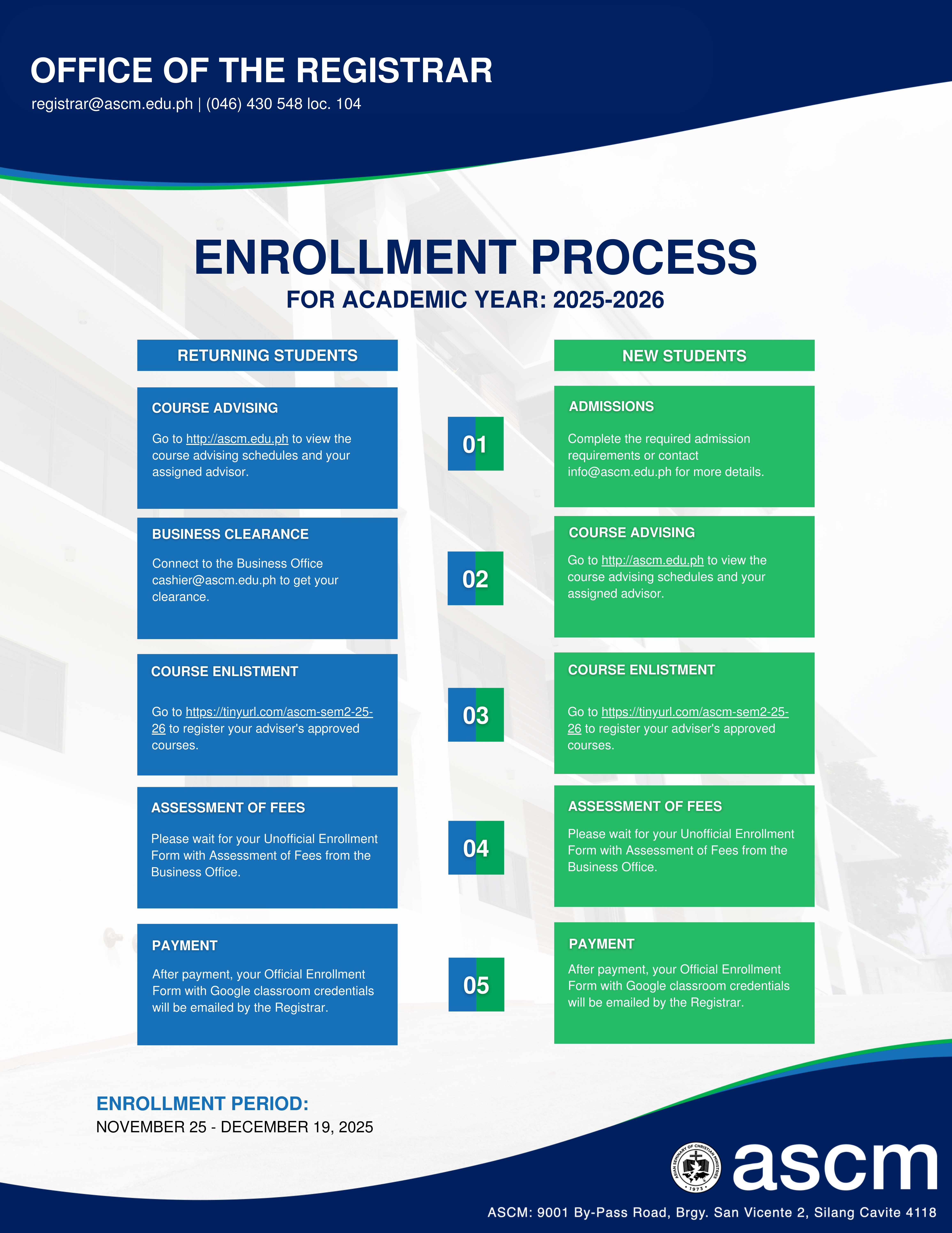 Admission to the Asian Seminary is based on evidence of academic ability as well as calling and potential for ministry leadership. Evidence of academic ability to take bachelor degree programs are assessed on the basis of the completion of Senior High School from a Department of Education (DepEd) accredited High School in the Philippines or equivalent school systems abroad. The minimum required academic qualification for taking graduate degree programs are assessed on the basis of the completion of a baccalaureate degree from a Commission on Higher Education (CHED) or equivalent higher education systems abroad.